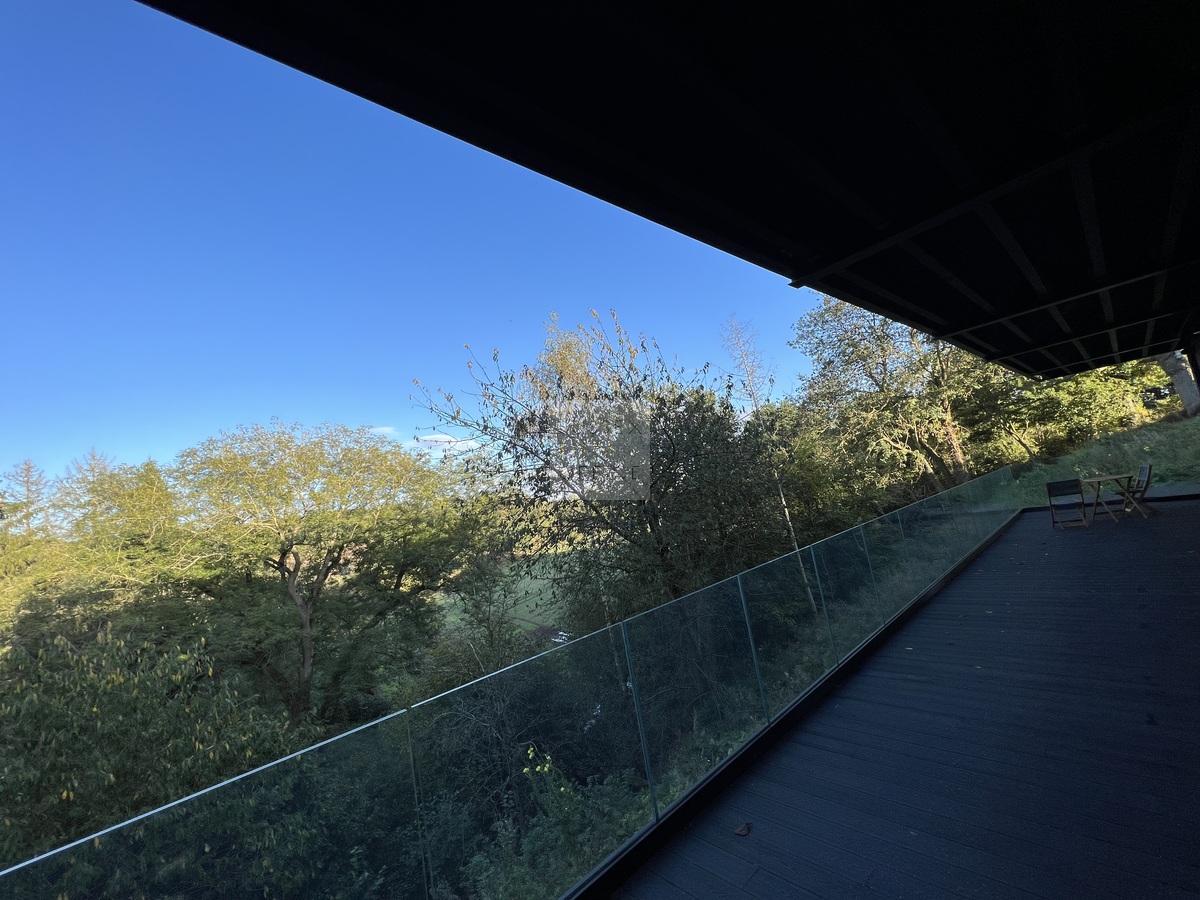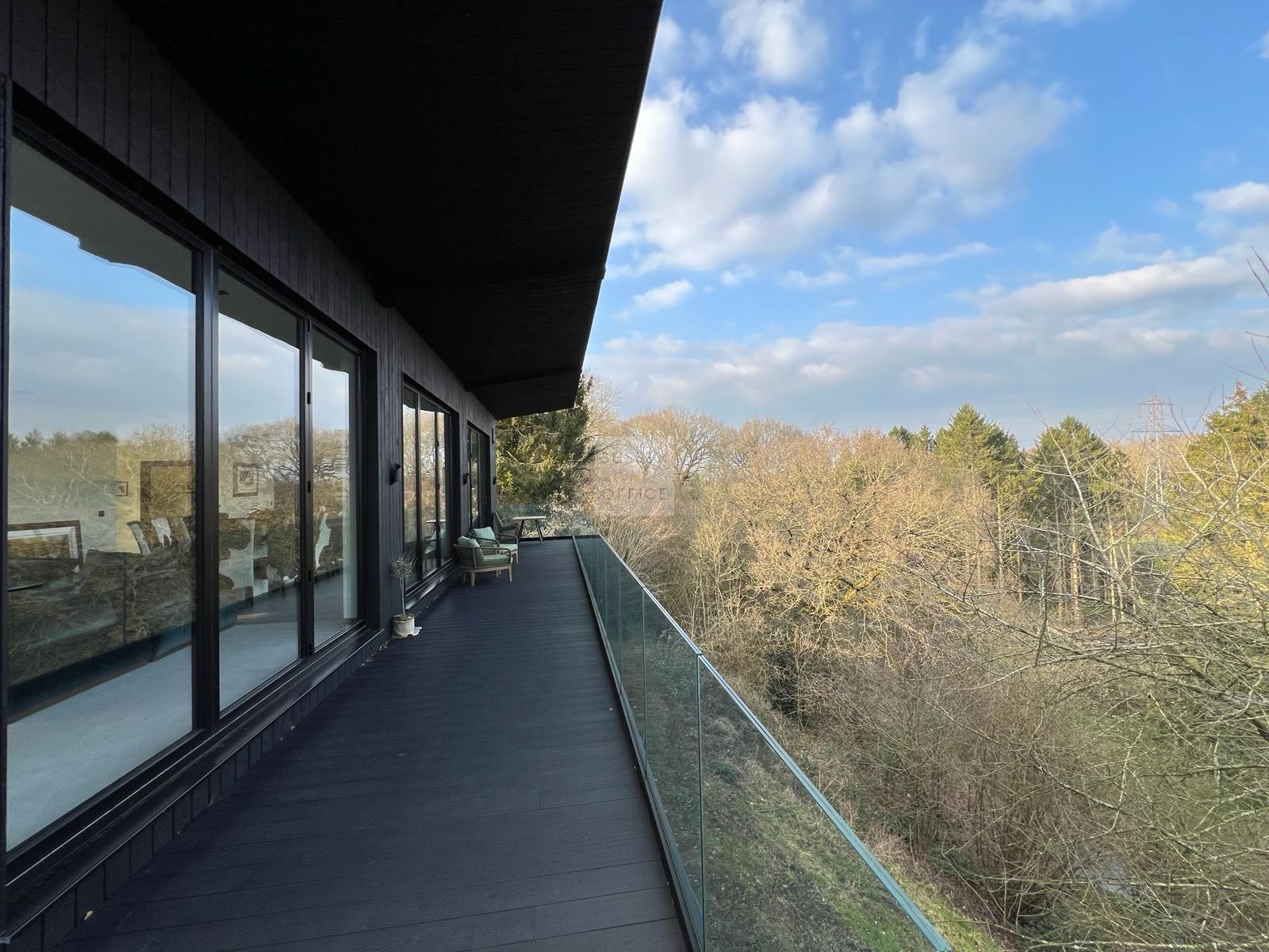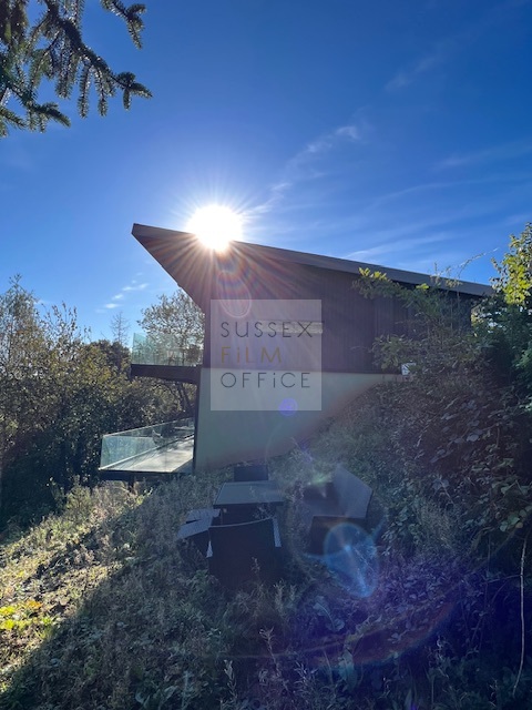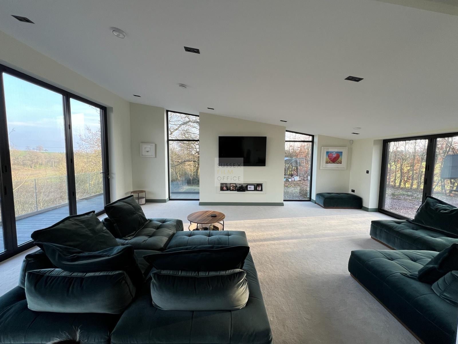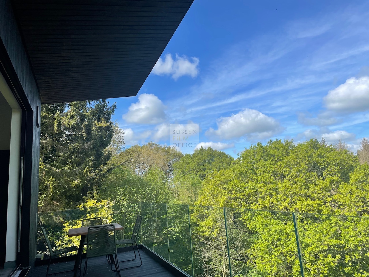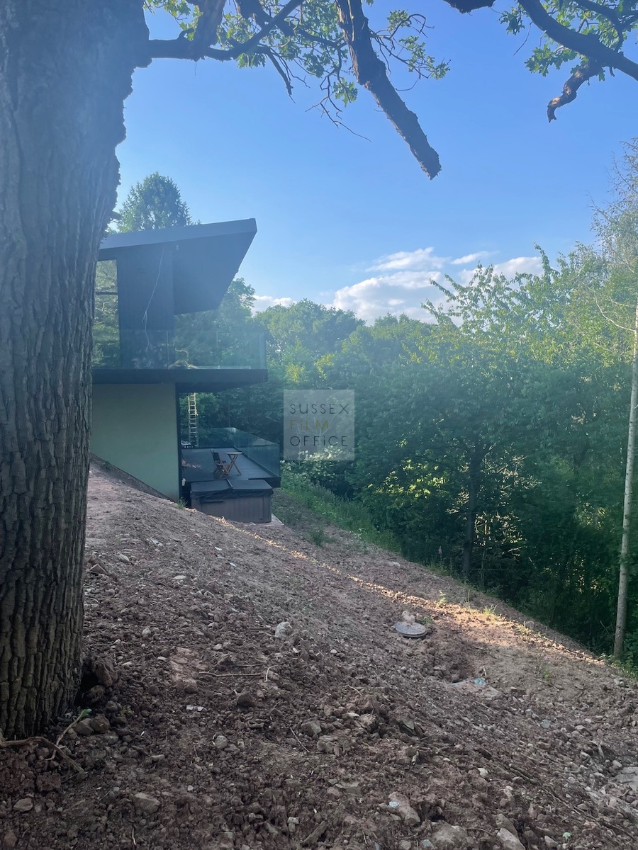 Large modern detached house set in 2 acres of woodland and accessed via a private road. The property, which is built into the side of the land, has an open plan living area on the entrance level, with the lower level comprising 3 bedrooms, ensuite, and 2 bathrooms, with each floor having floor to ceiling windows, and wrap around balconies accessed via full-length glass doors. Outside there is a hot tub, summer house, outbuilding, fields, and a brook at the bottom of the garden. This is a fantastic and secluded location for filming and photography.