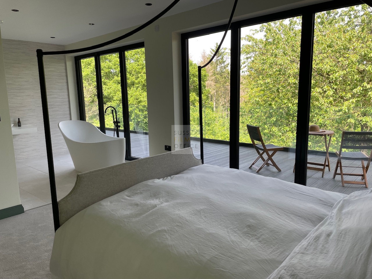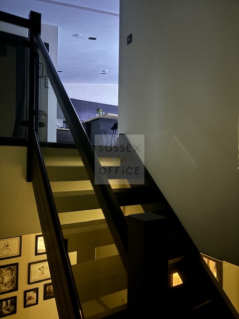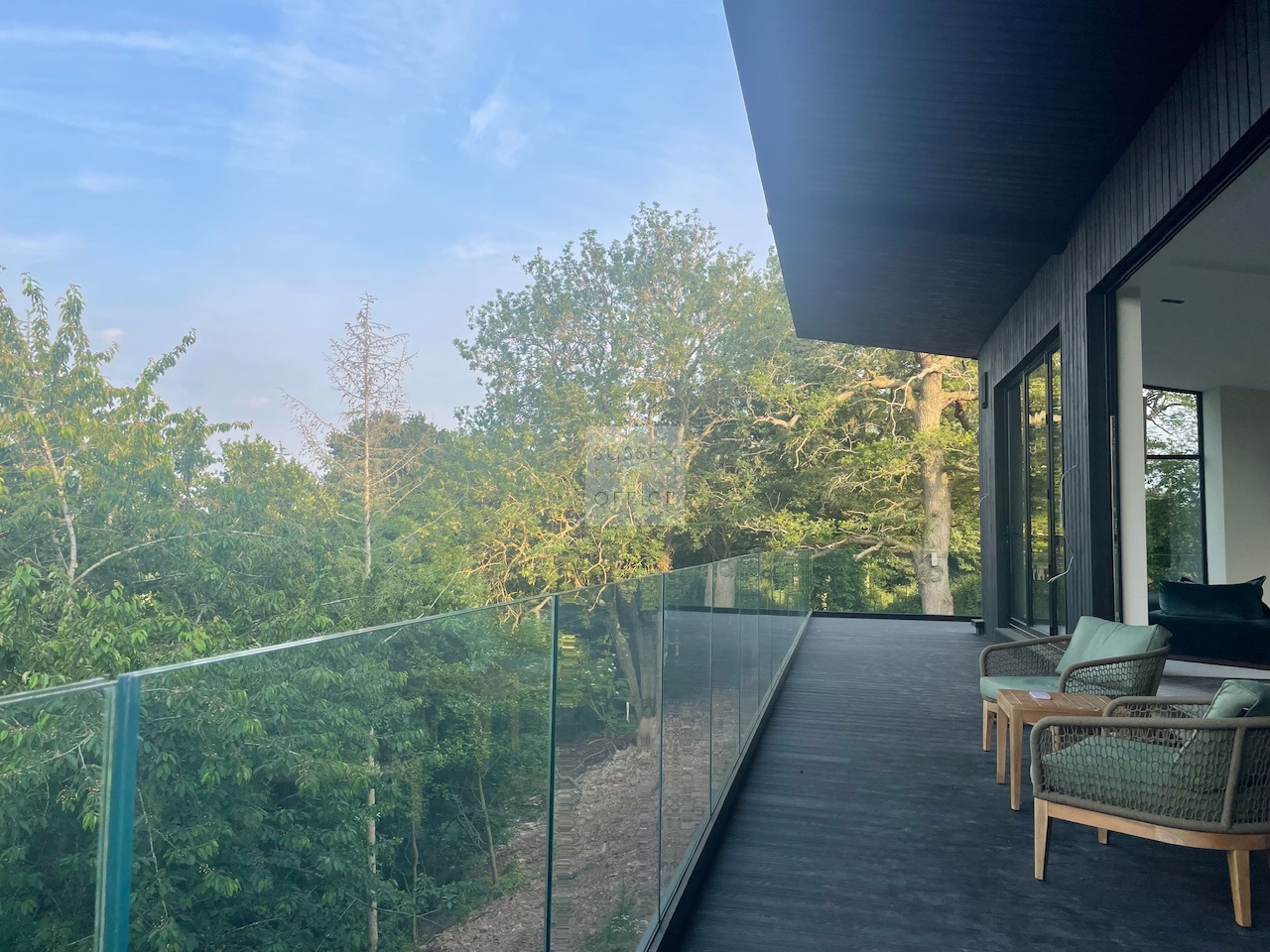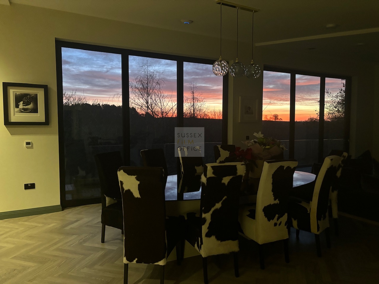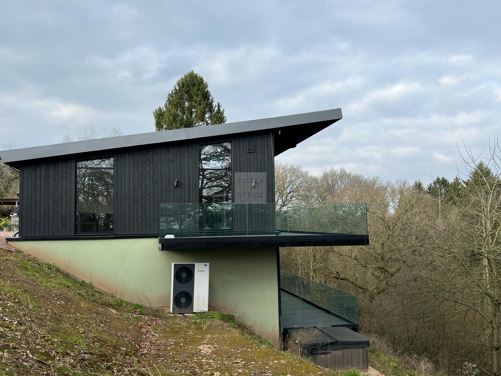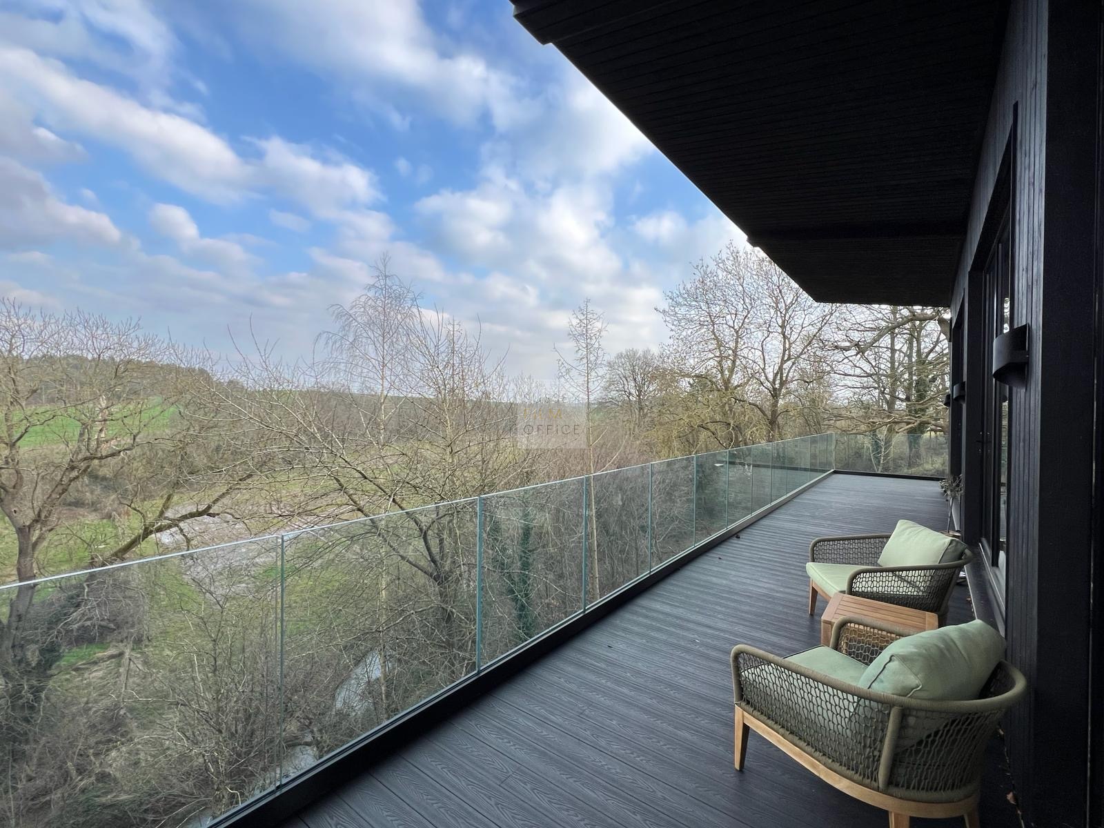 Large modern detached house set in 2 acres of woodland and accessed via a private road. The property, which is built into the side of the land, has an open plan living area on the entrance level, with the lower level comprising 3 bedrooms, ensuite, and 2 bathrooms, with each floor having floor to ceiling windows, and wrap around balconies accessed via full-length glass doors. Outside there is a hot tub, summer house, outbuilding, fields, and a brook at the bottom of the garden. This is a fantastic and secluded location for filming and photography.