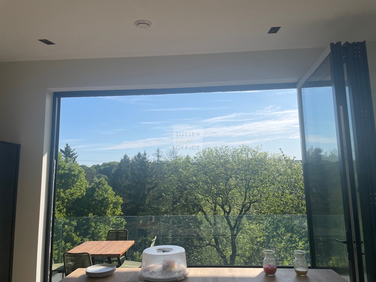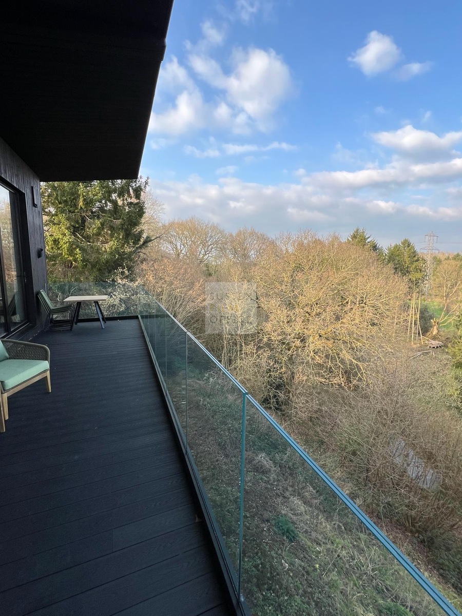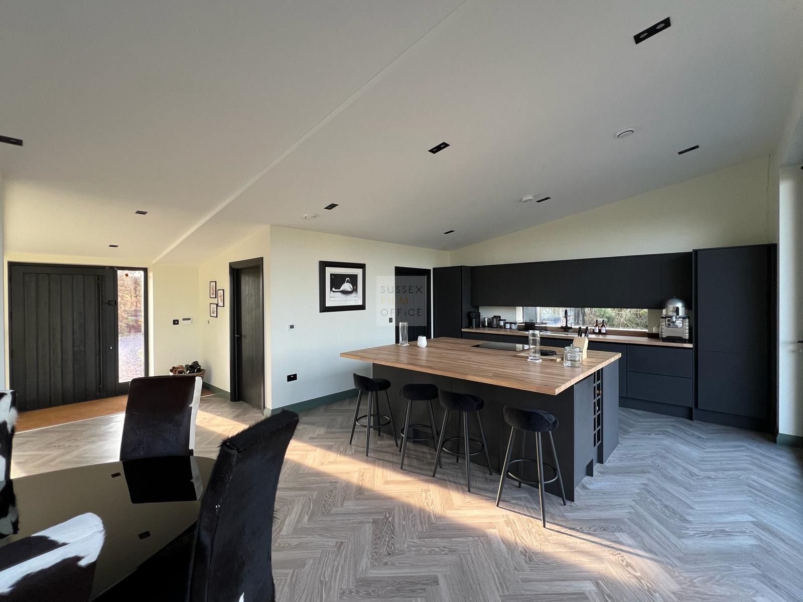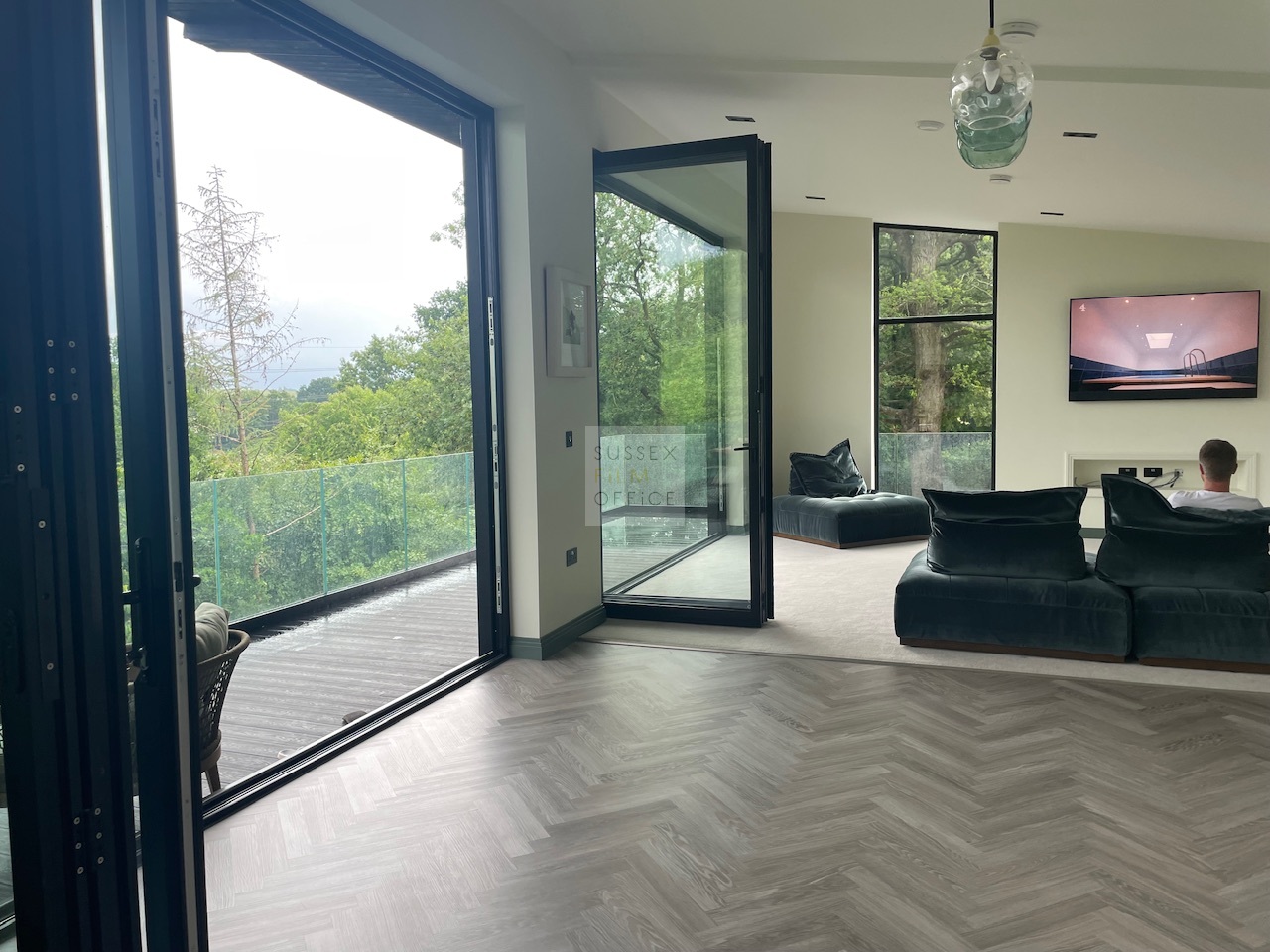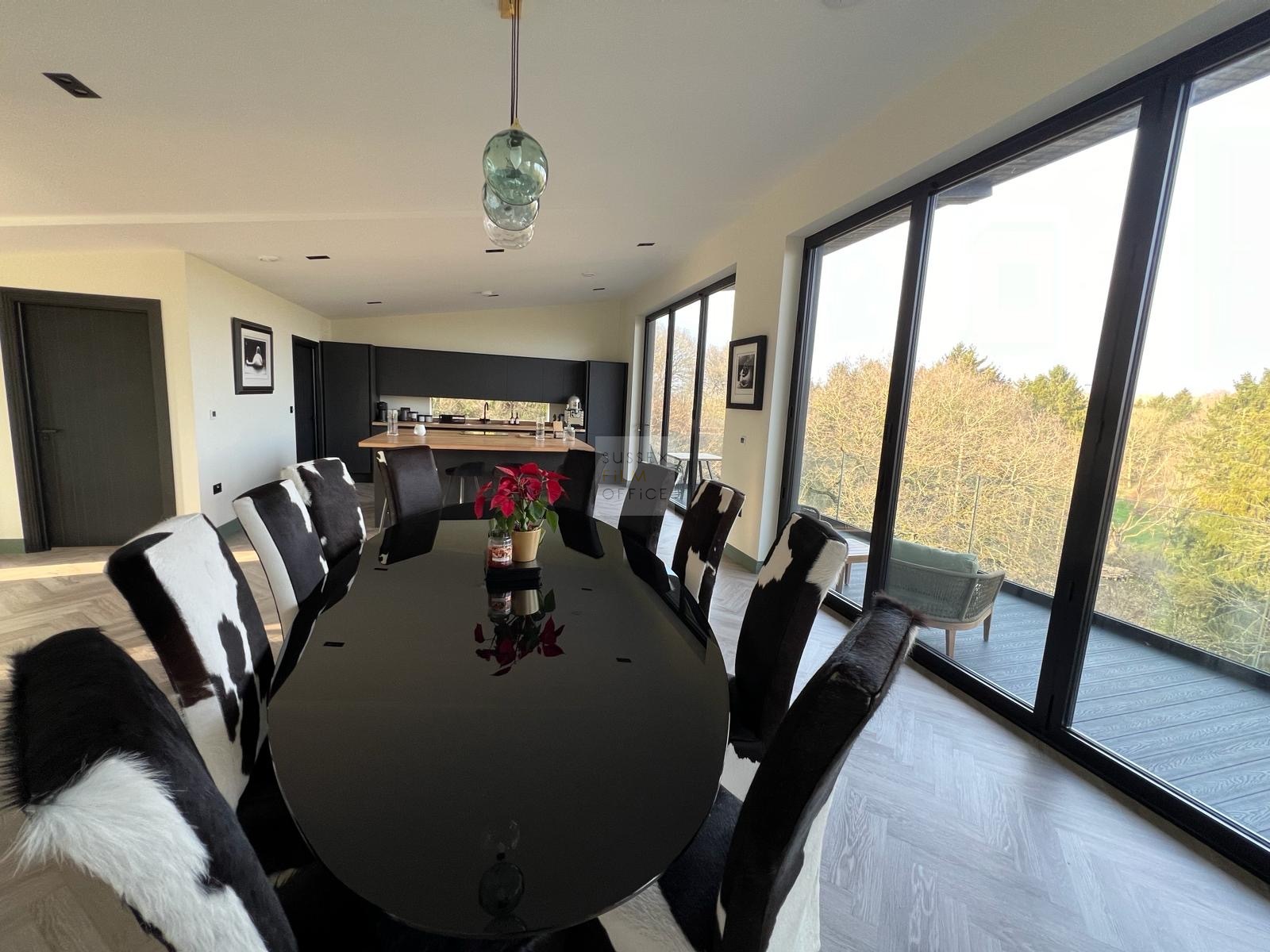 Large modern detached house set in 2 acres of woodland and accessed via a private road. The property, which is built into the side of the land, has an open plan living area on the entrance level, with the lower level comprising 3 bedrooms, ensuite, and 2 bathrooms, with each floor having floor to ceiling windows, and wrap around balconies accessed via full-length glass doors. Outside there is a hot tub, summer house, outbuilding, fields, and a brook at the bottom of the garden. This is a fantastic and secluded location for filming and photography.