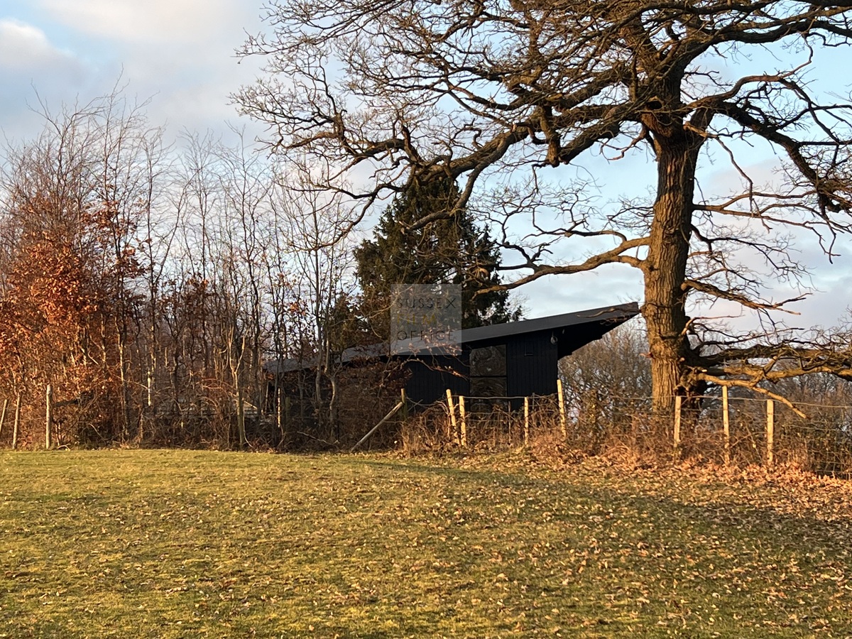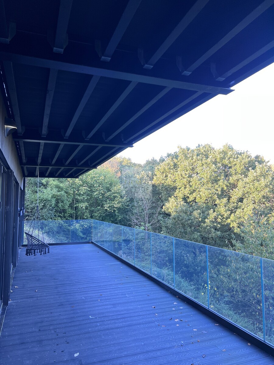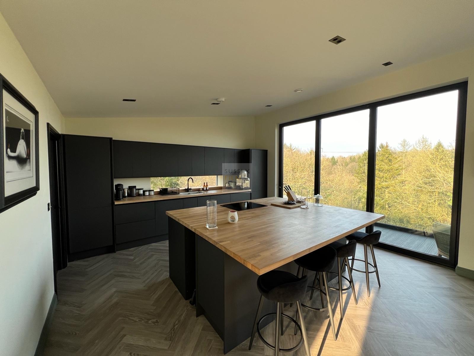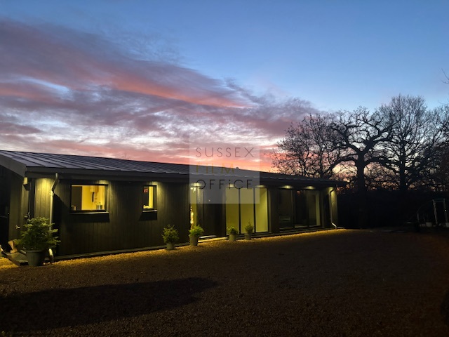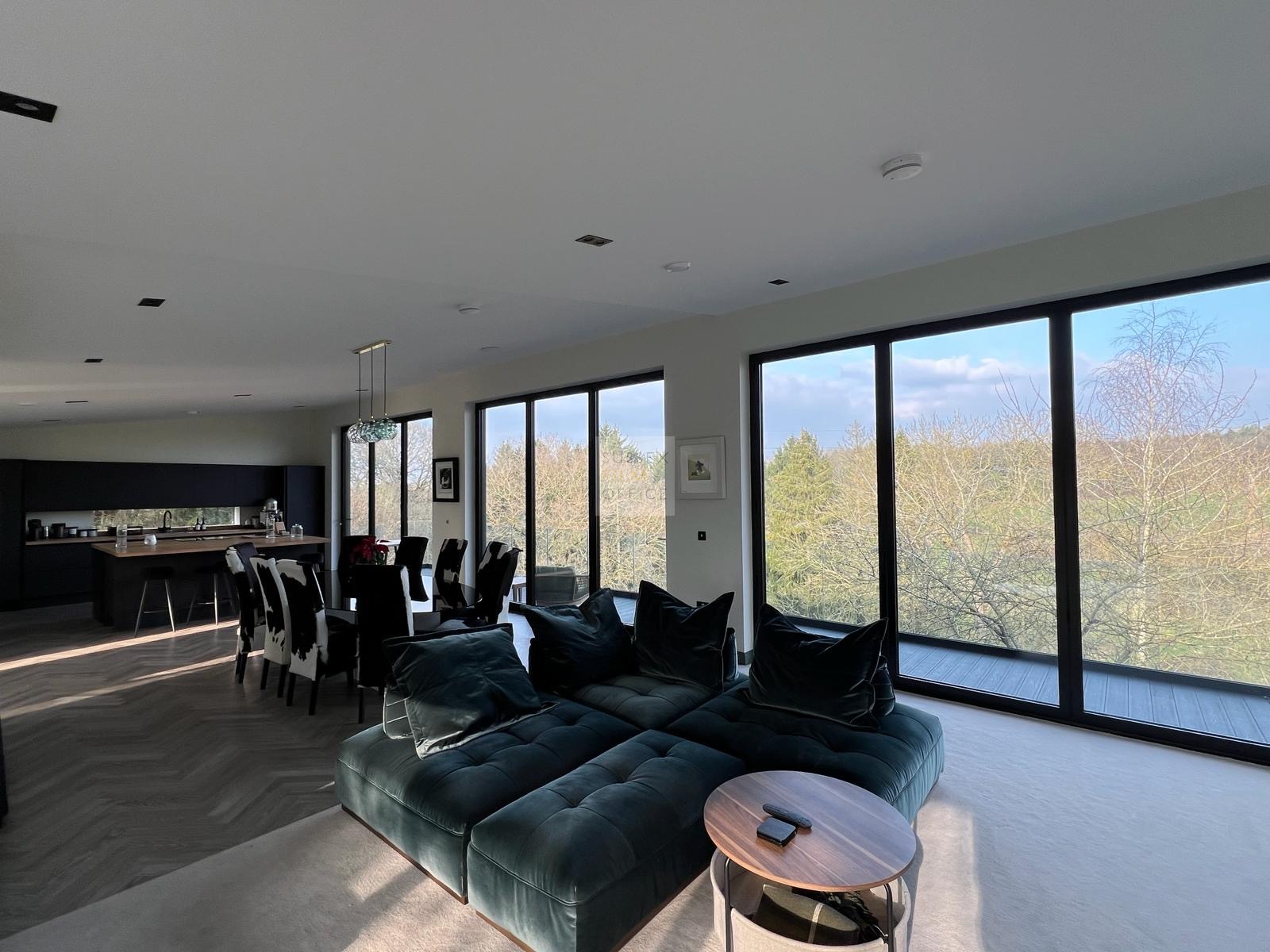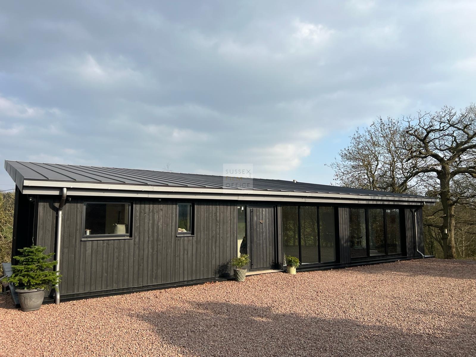 Large modern detached house set in 2 acres of woodland and accessed via a private road. The property, which is built into the side of the land, has an open plan living area on the entrance level, with the lower level comprising 3 bedrooms, ensuite, and 2 bathrooms, with each floor having floor to ceiling windows, and wrap around balconies accessed via full-length glass doors. Outside there is a hot tub, summer house, outbuilding, fields, and a brook at the bottom of the garden. This is a fantastic and secluded location for filming and photography.