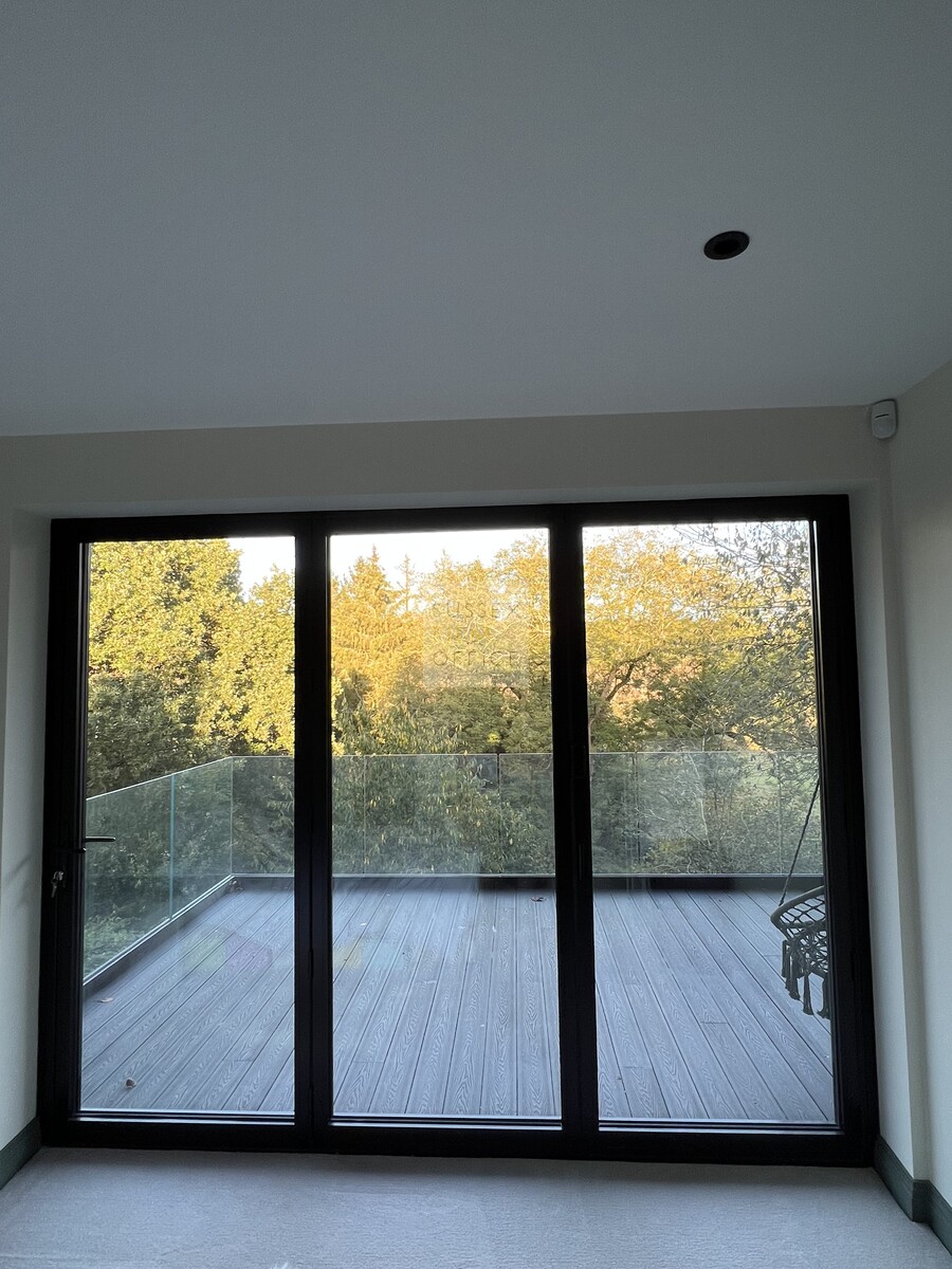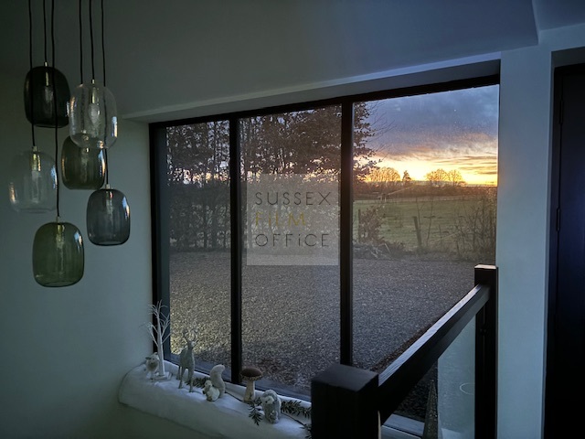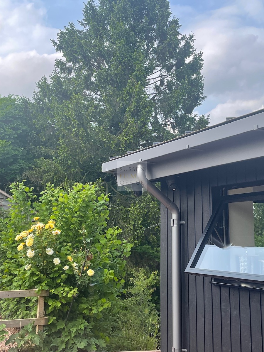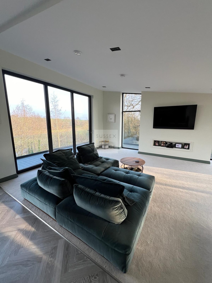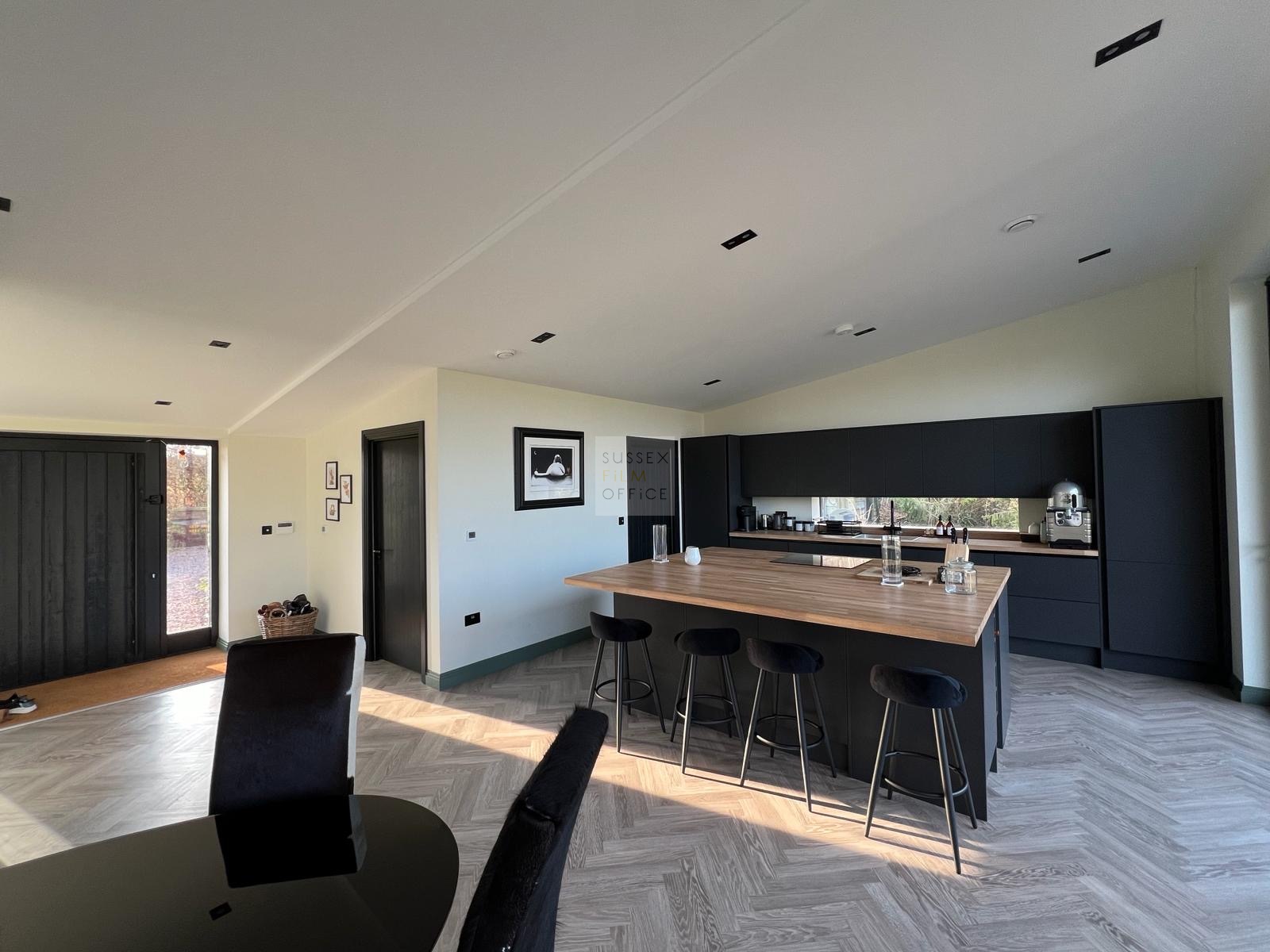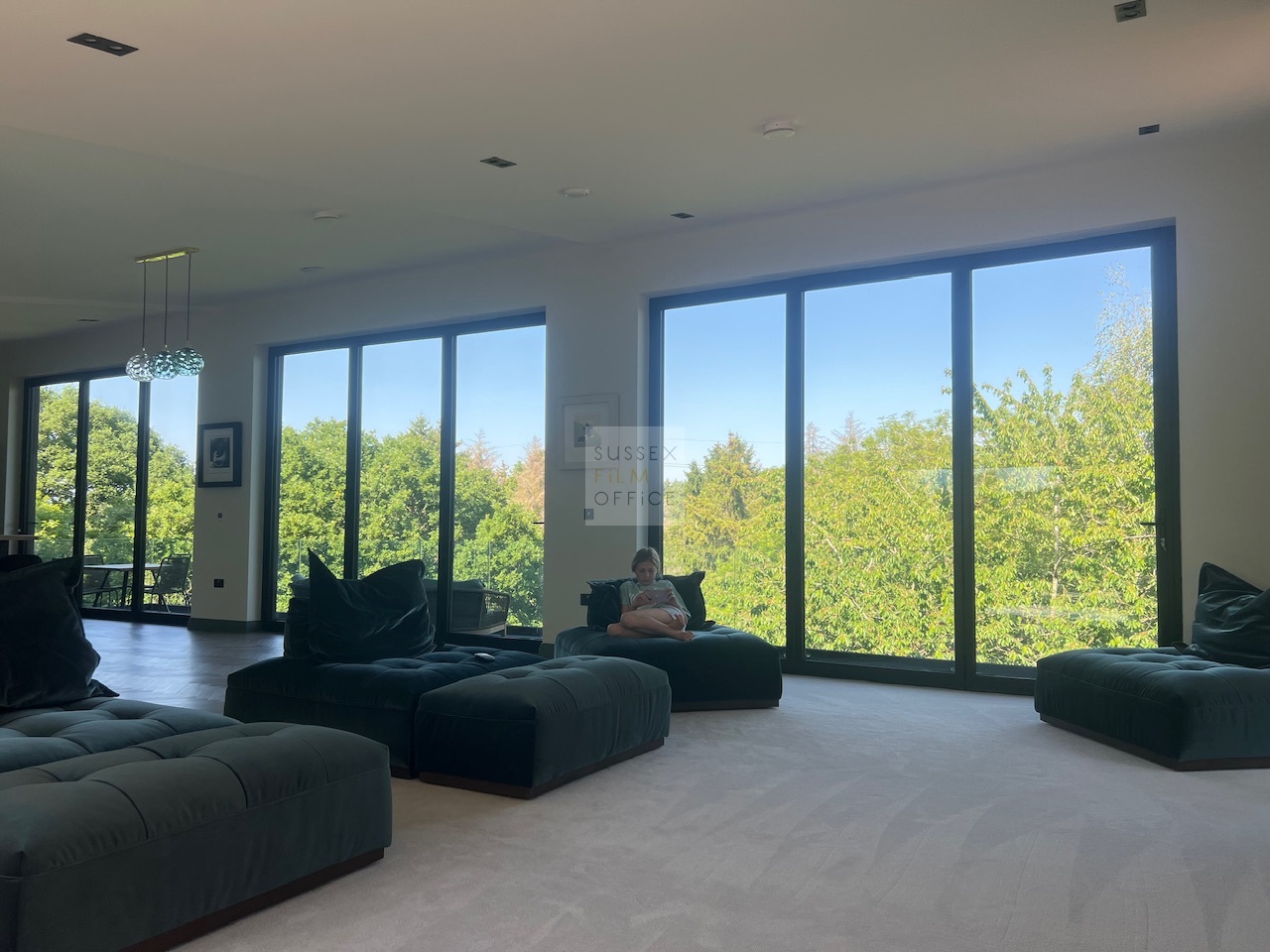 Large modern detached house set in 2 acres of woodland and accessed via a private road. The property, which is built into the side of the land, has an open plan living area on the entrance level, with the lower level comprising 3 bedrooms, ensuite, and 2 bathrooms, with each floor having floor to ceiling windows, and wrap around balconies accessed via full-length glass doors. Outside there is a hot tub, summer house, outbuilding, fields, and a brook at the bottom of the garden. This is a fantastic and secluded location for filming and photography.