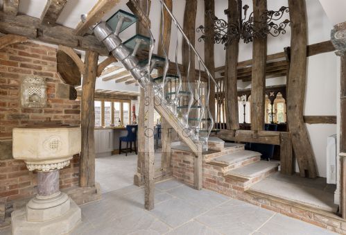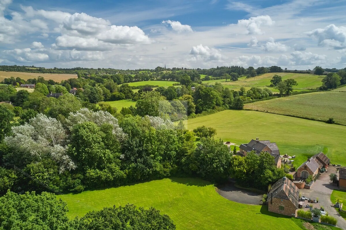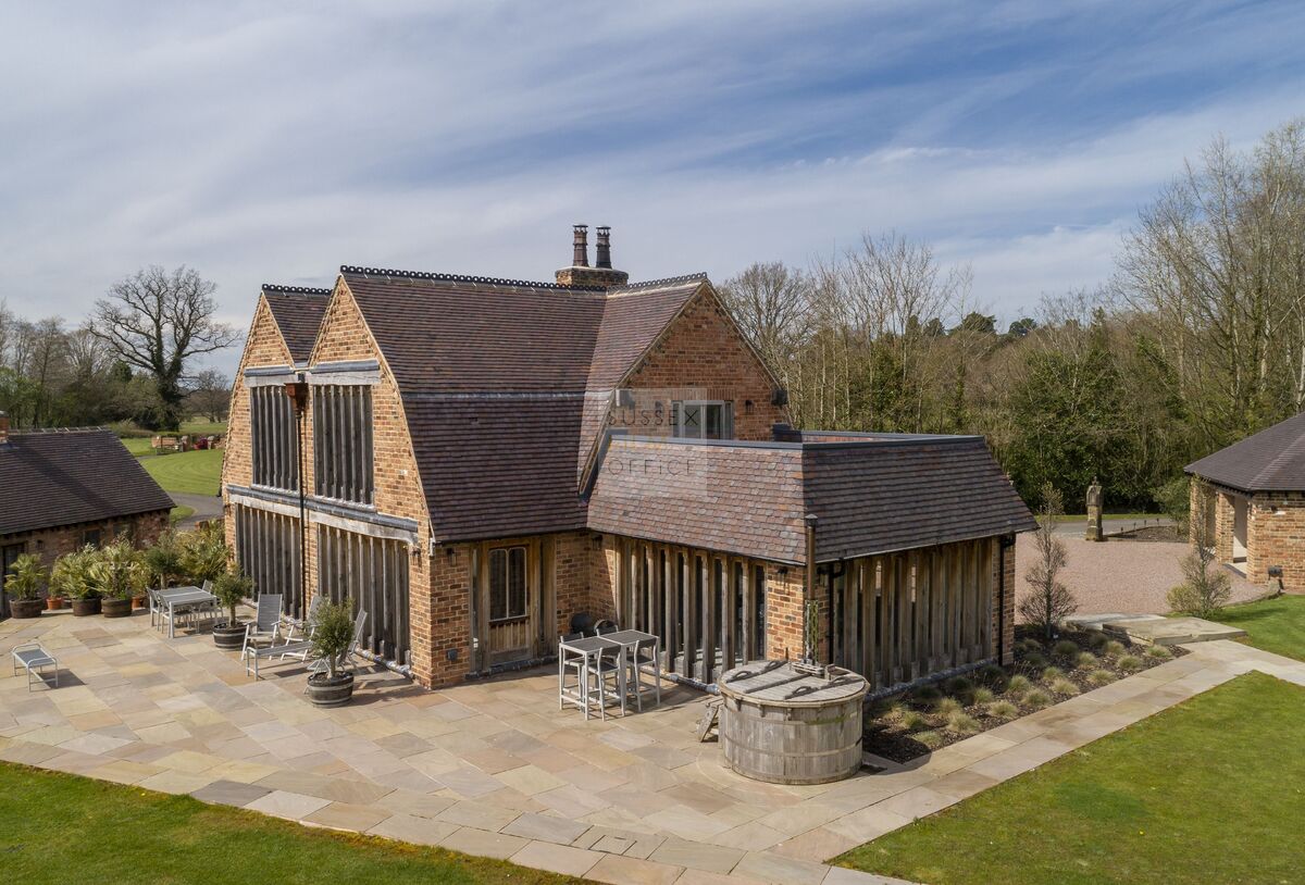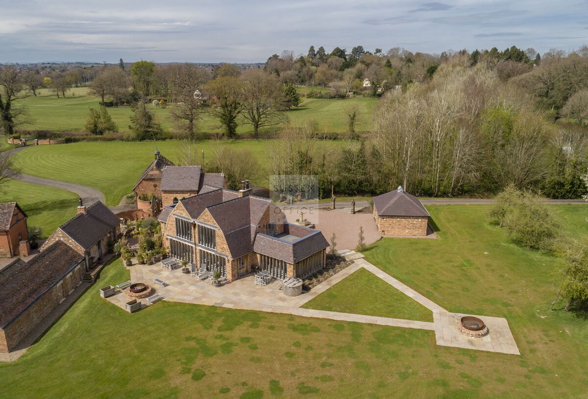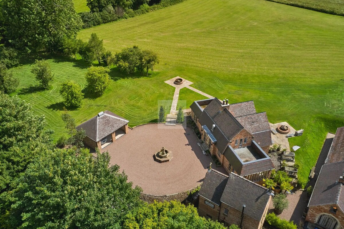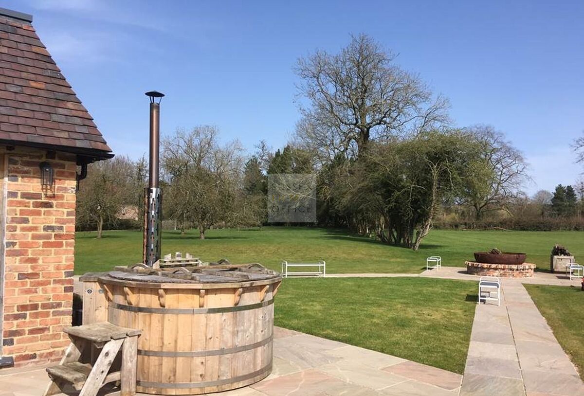 A stunning, oak framed, detached property with panoramic views from every room across unspoilt countryside, set within its own four acres. The house, situated off its own private drive and courtyard with a charming French square fountain, provides an abundance of characterful, tasteful and unique features. On the ground floor is the entrance hall, large bright kitchen, inglenook snug, sun room, dining room, formal sitting room, and cloakroom. The first floor comprises 3 bedrooms (1 with ensuite), and a shower room. Outside there is a South-facing rear patio with Swiss style wood fired hot tub, two monumental iron fire pits and barbecue, a range of outdoor seating, four acres of grounds including a stream and an orchard, a double garage, and electric car charging point. An absolutely stunning location for filming and photography!