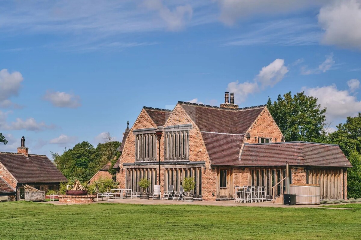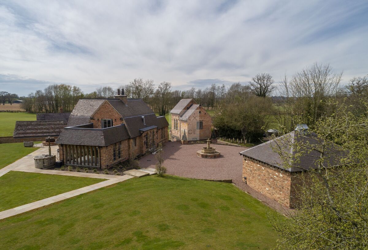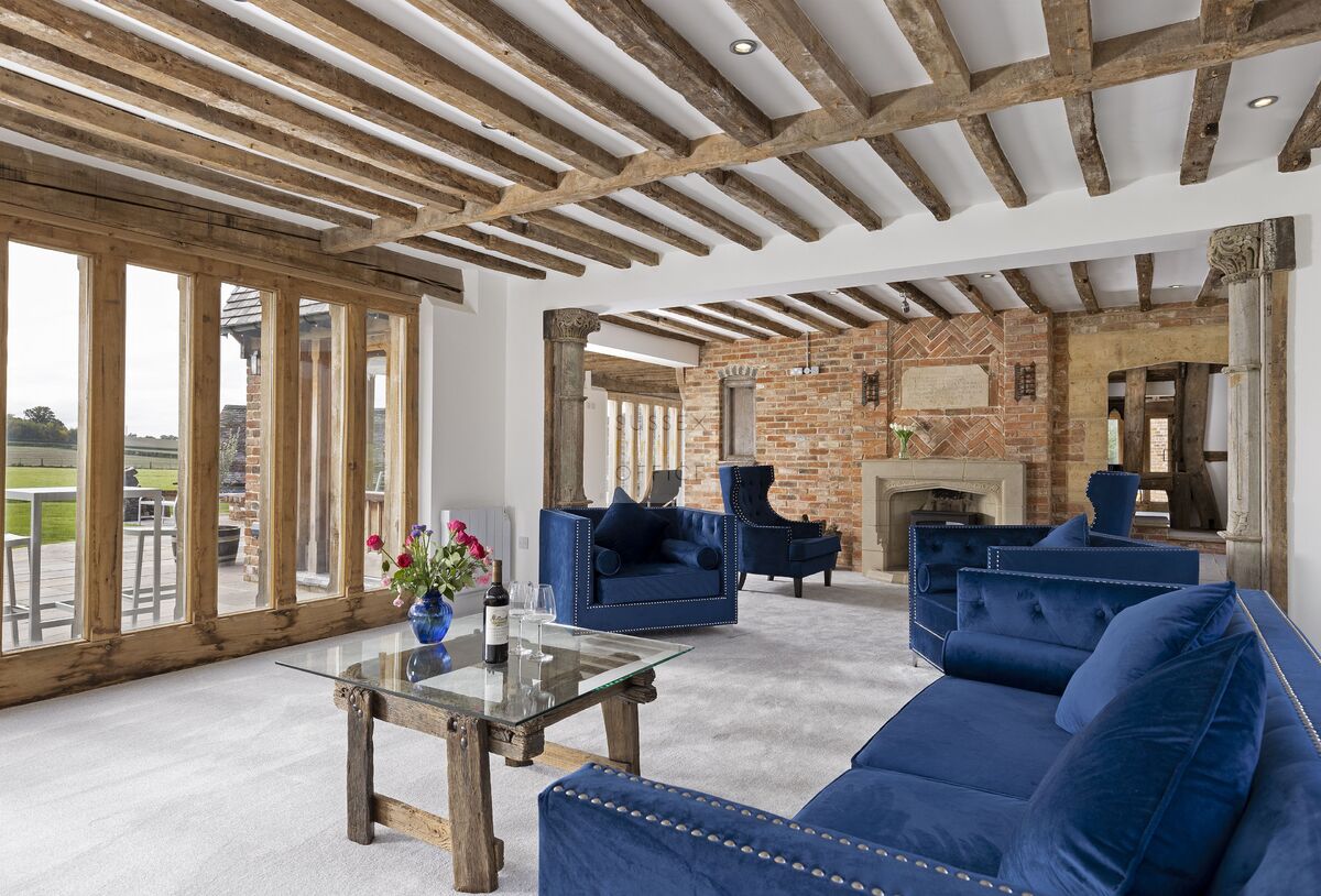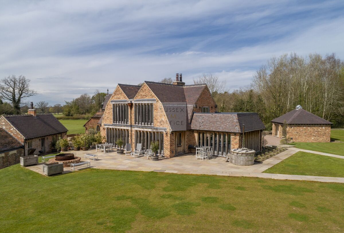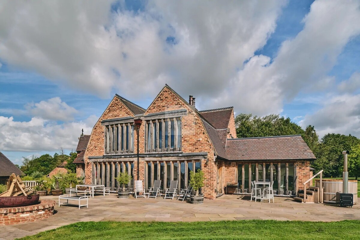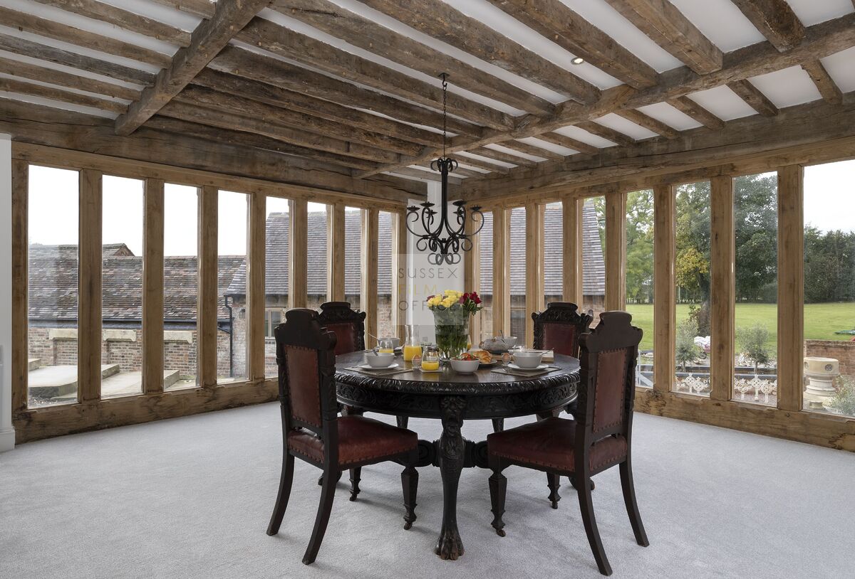 A stunning, oak framed, detached property with panoramic views from every room across unspoilt countryside, set within its own four acres. The house, situated off its own private drive and courtyard with a charming French square fountain, provides an abundance of characterful, tasteful and unique features. On the ground floor is the entrance hall, large bright kitchen, inglenook snug, sun room, dining room, formal sitting room, and cloakroom. The first floor comprises 3 bedrooms (1 with ensuite), and a shower room. Outside there is a South-facing rear patio with Swiss style wood fired hot tub, two monumental iron fire pits and barbecue, a range of outdoor seating, four acres of grounds including a stream and an orchard, a double garage, and electric car charging point. An absolutely stunning location for filming and photography!